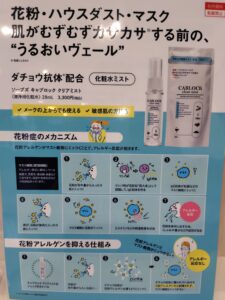 サロンではスギ・ヒノキ・イネ・ブタクサの花粉抗体原料(ダチョウ卵黄エキス)を配合した化粧水ミストを取り扱ってます
